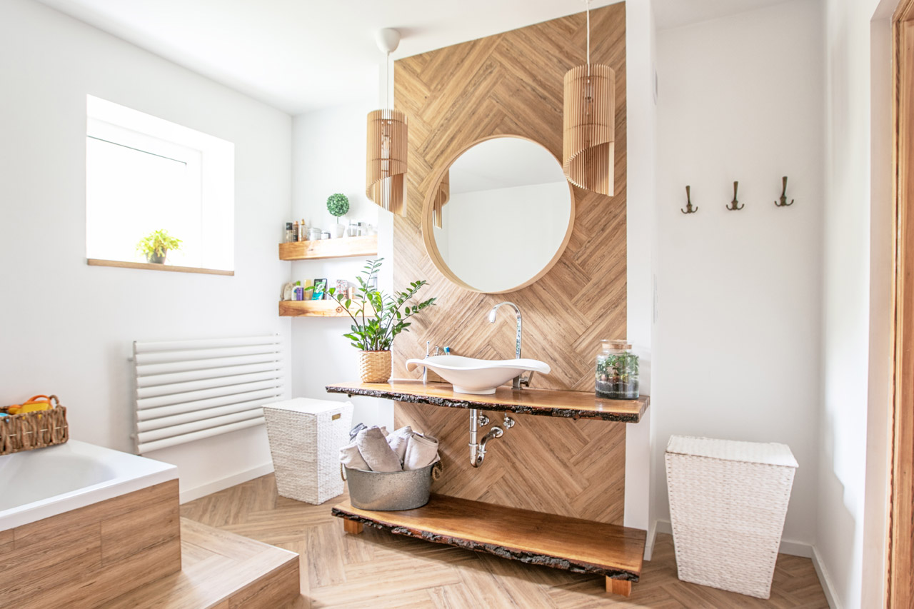 Intr-un mediu umed precum baia, este, fara indoiala, necesara o pardoseala rezistenta la conditiile umede . Ne putem referi si la natura punand o planta, un parfum de camera, un taburet din lemn natural si asa mai departe.